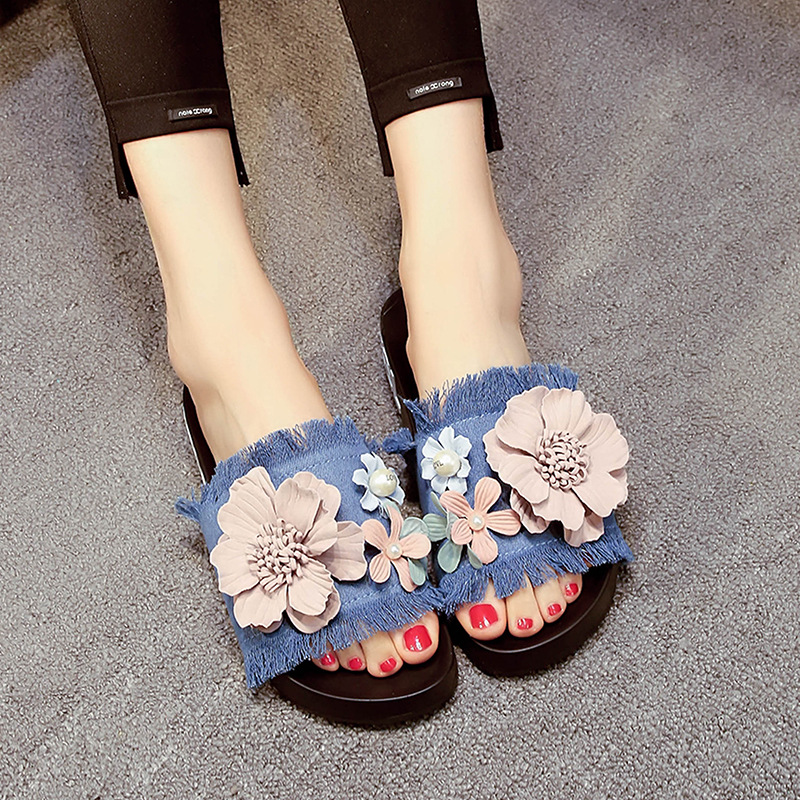Women Casual Beach Flowers Denim Cloth Slippers