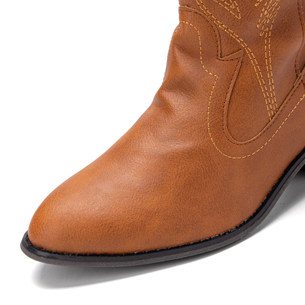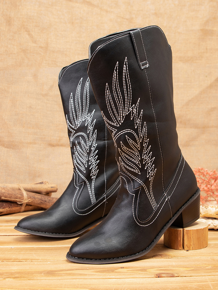 Women Leather Embroidery Pattern Pointy Toe Chunky Heel Trendy Knight Cowboy Boots