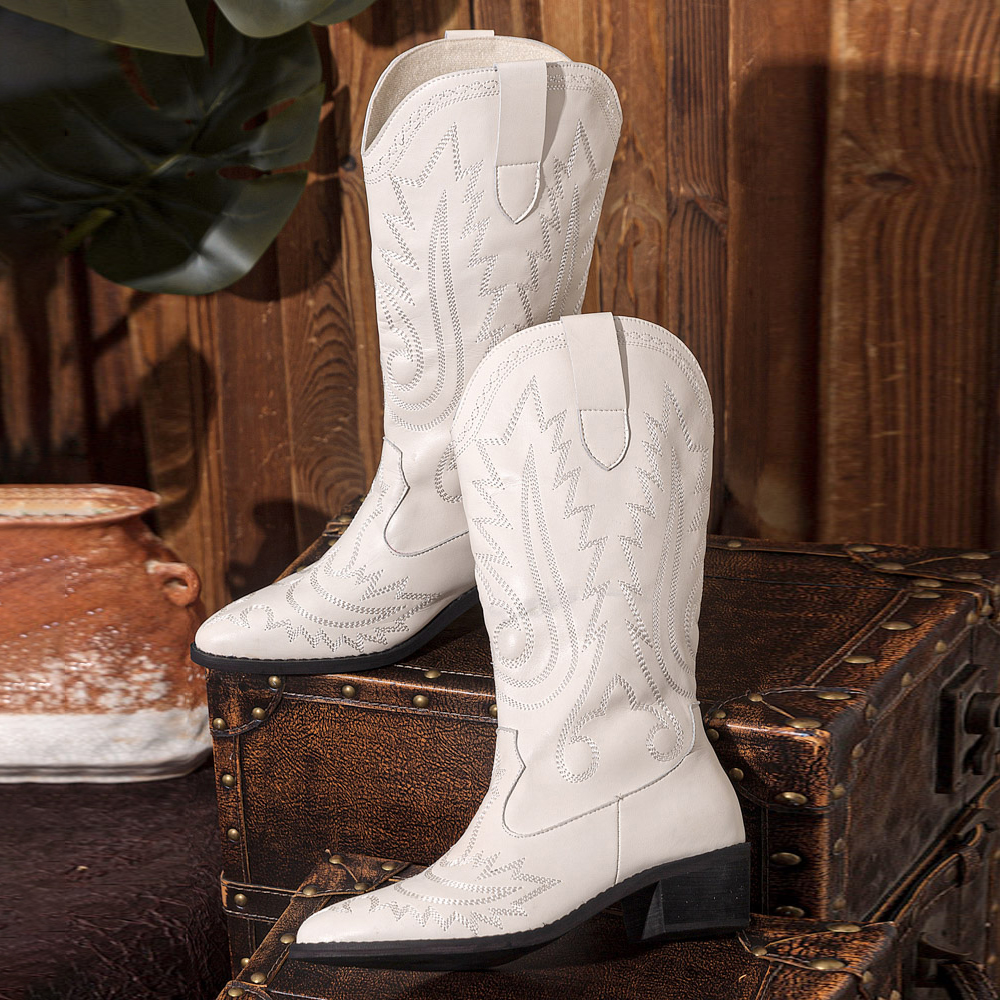 Women Retro Brief Embroidery Leather V-Cut Mid-calf Pull On Casual Martin Knight Boots