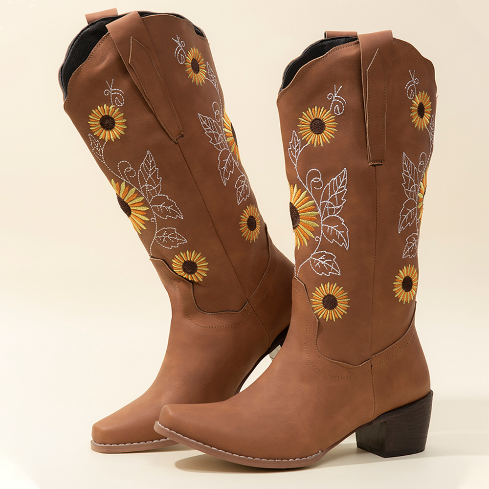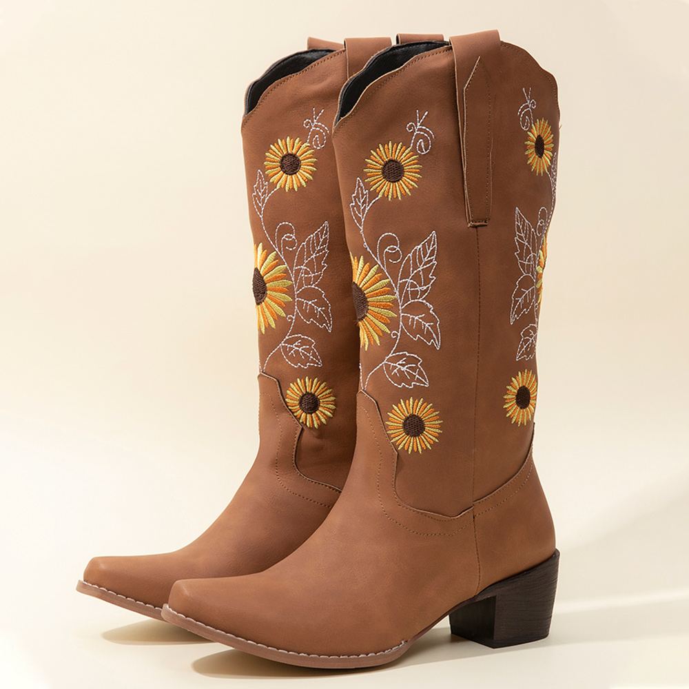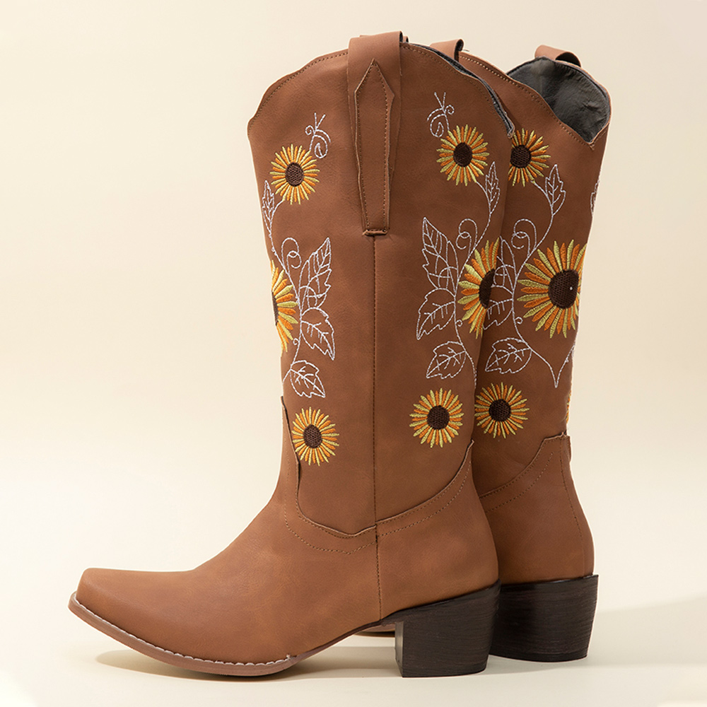 Plus Size Women Retro Sunflower Embroidered Chunky Heel Mid Calf Cowboy Boots