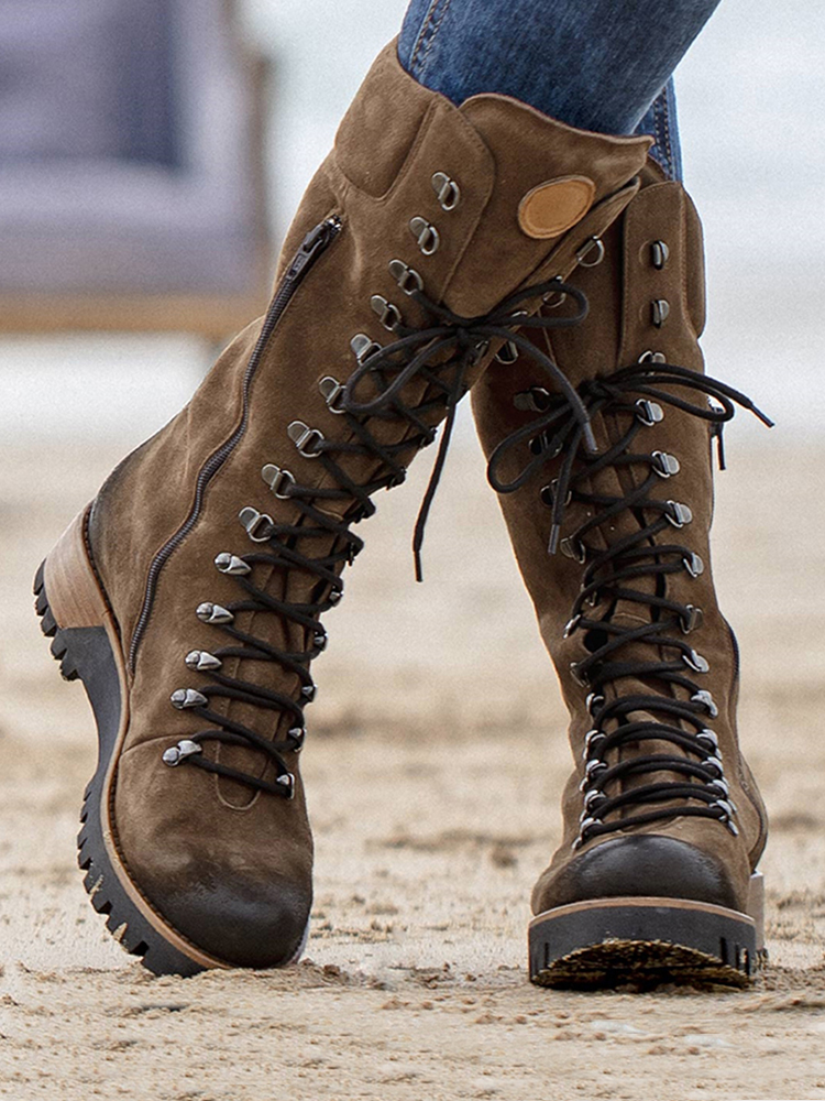 Plus Size Women Wearable Suede Side Zipper Mid Calf Combat Boots