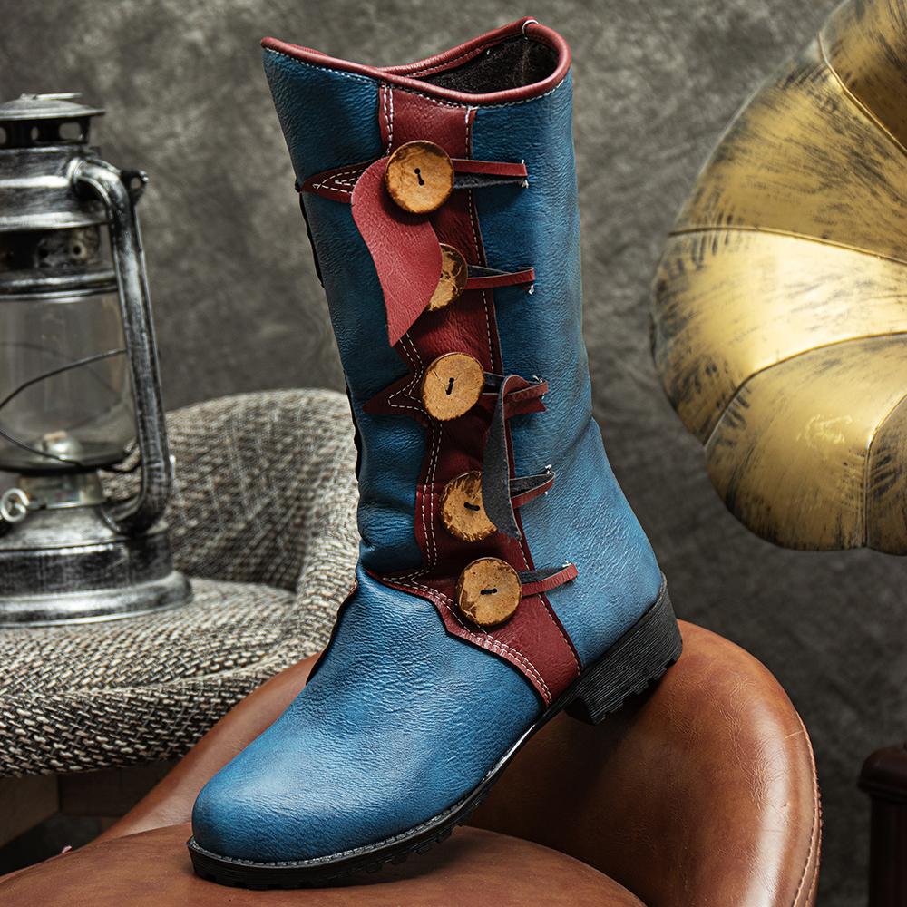 Women PU Leather Round Head Waterproof Non-slip Wear Resistant Mid-calf Boots