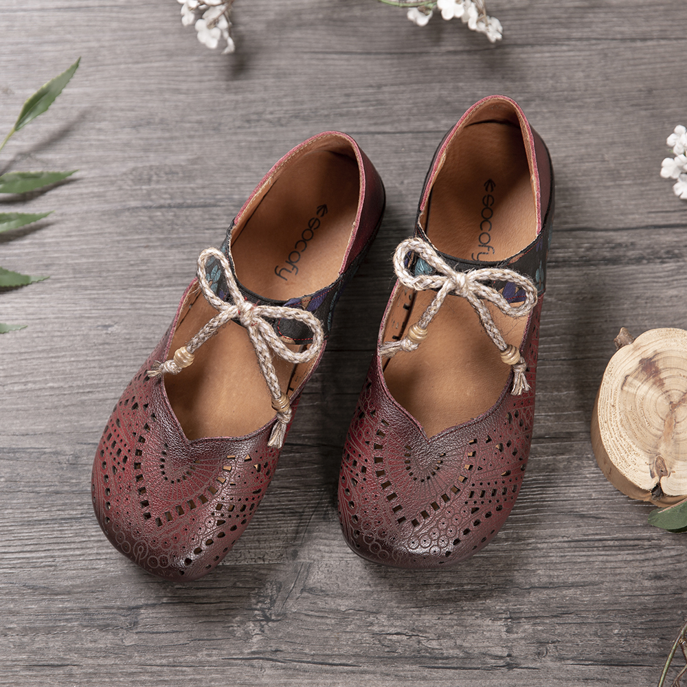 Retro Hollow Floral Soft Sole Knot Round Toe Ankle Strap Flat Shoes