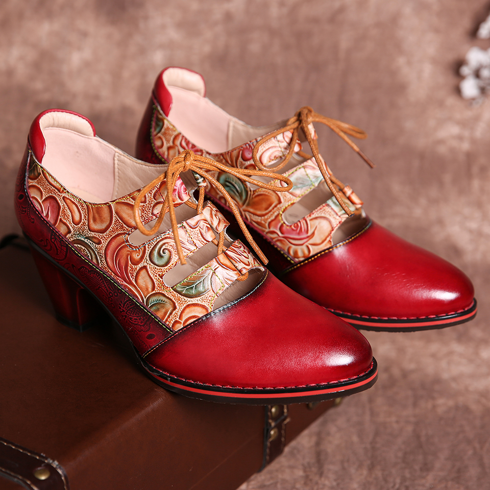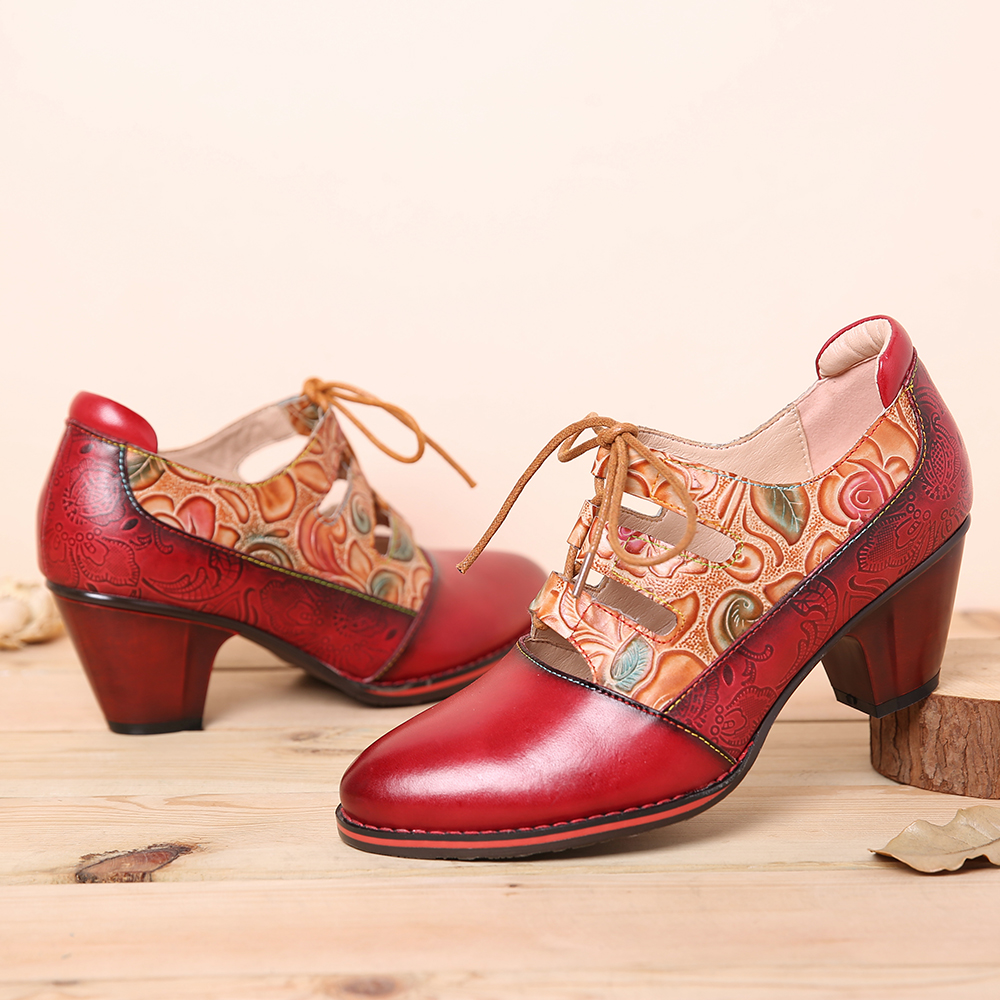 SOCOFY Leather Embossed Flowers Splicing Cut out Lace-up Chunky Heel Pumps Dress Shoes