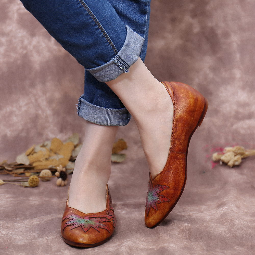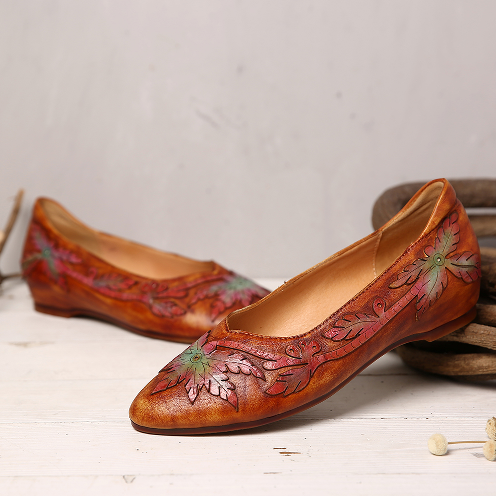 Retro Splicing Vine Comfy Genuine Leather Pointed Toe Slip On Flat Shoes