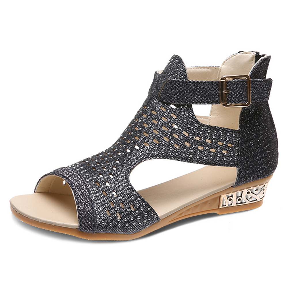 Plus Size Women Back-zip Soft Comfy Breathable Hollow Rhinestone Embellished Flat Sandals