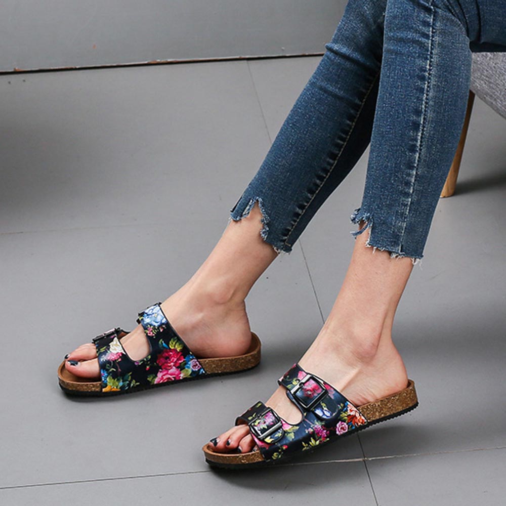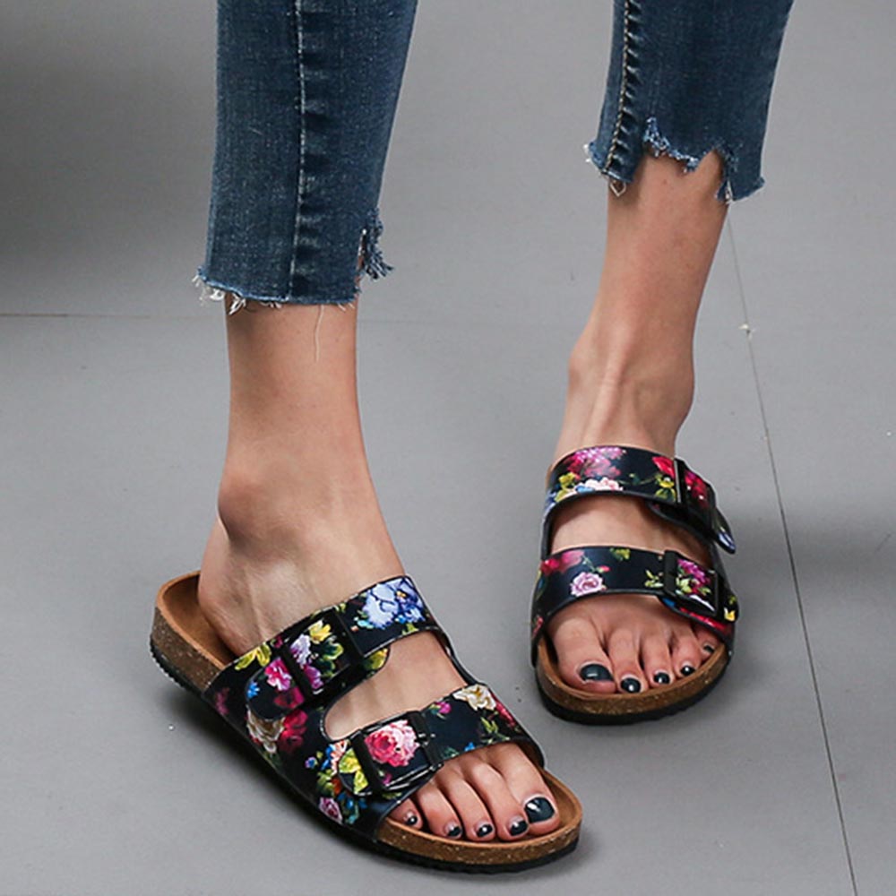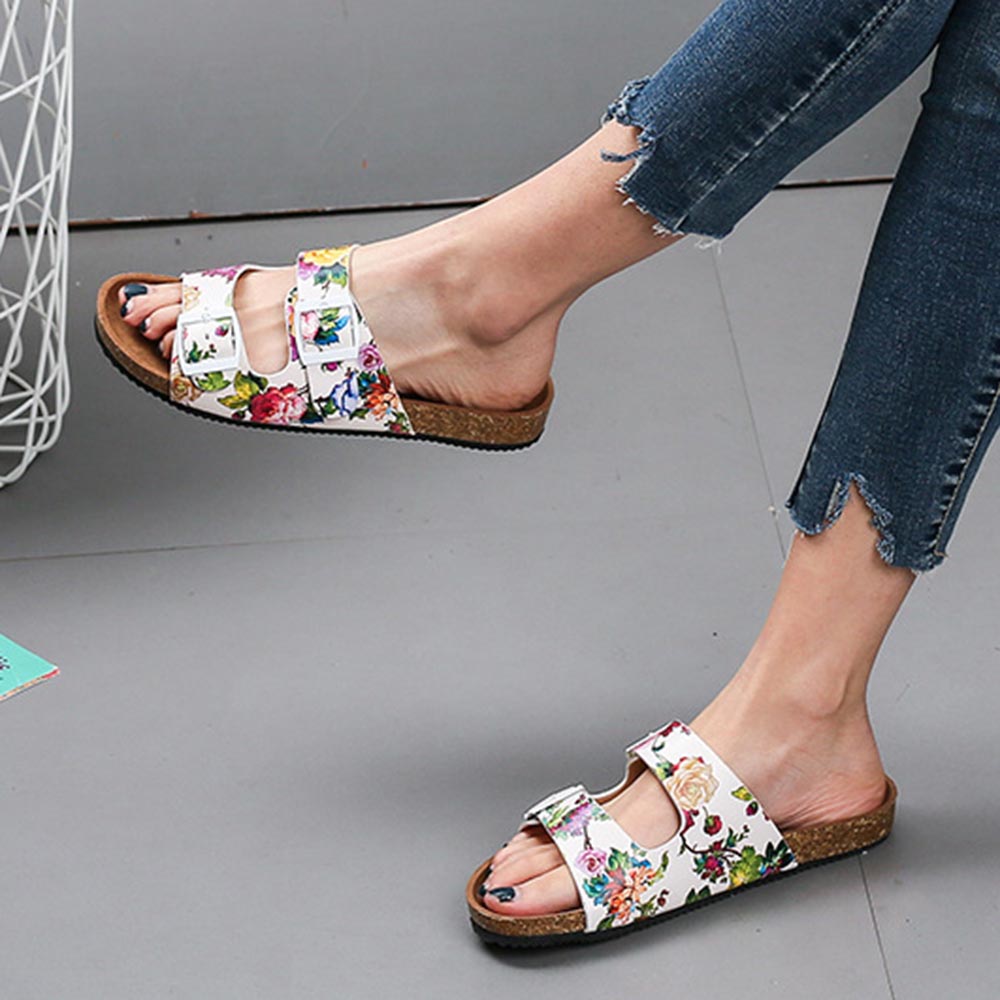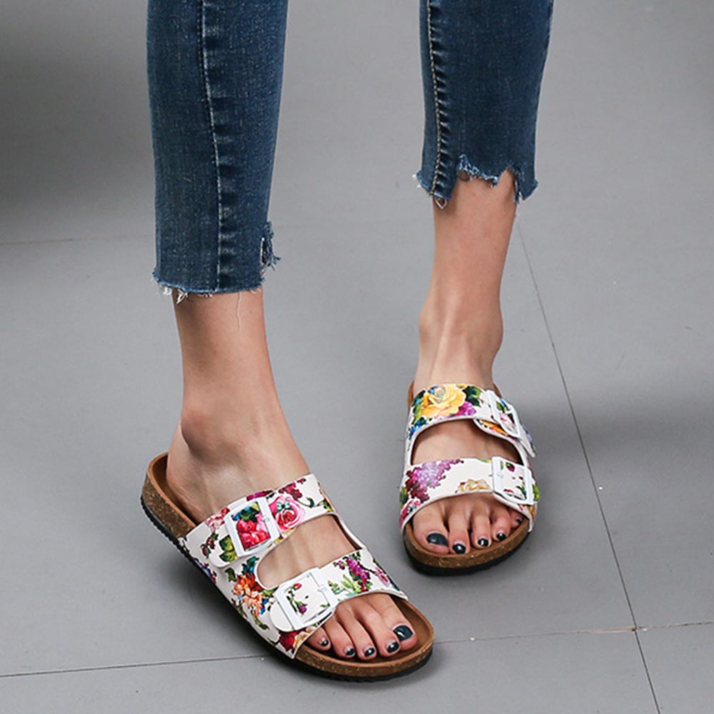 Women Double Buckle Flowers Pattern Strap Cork Footbed Slide Sandals