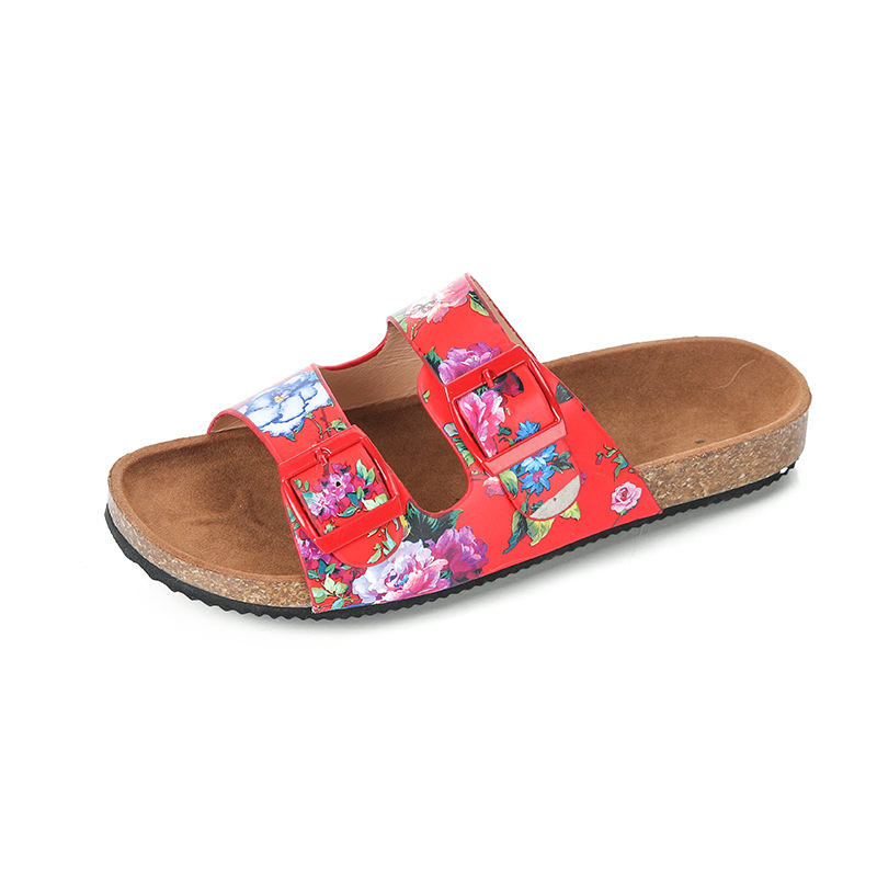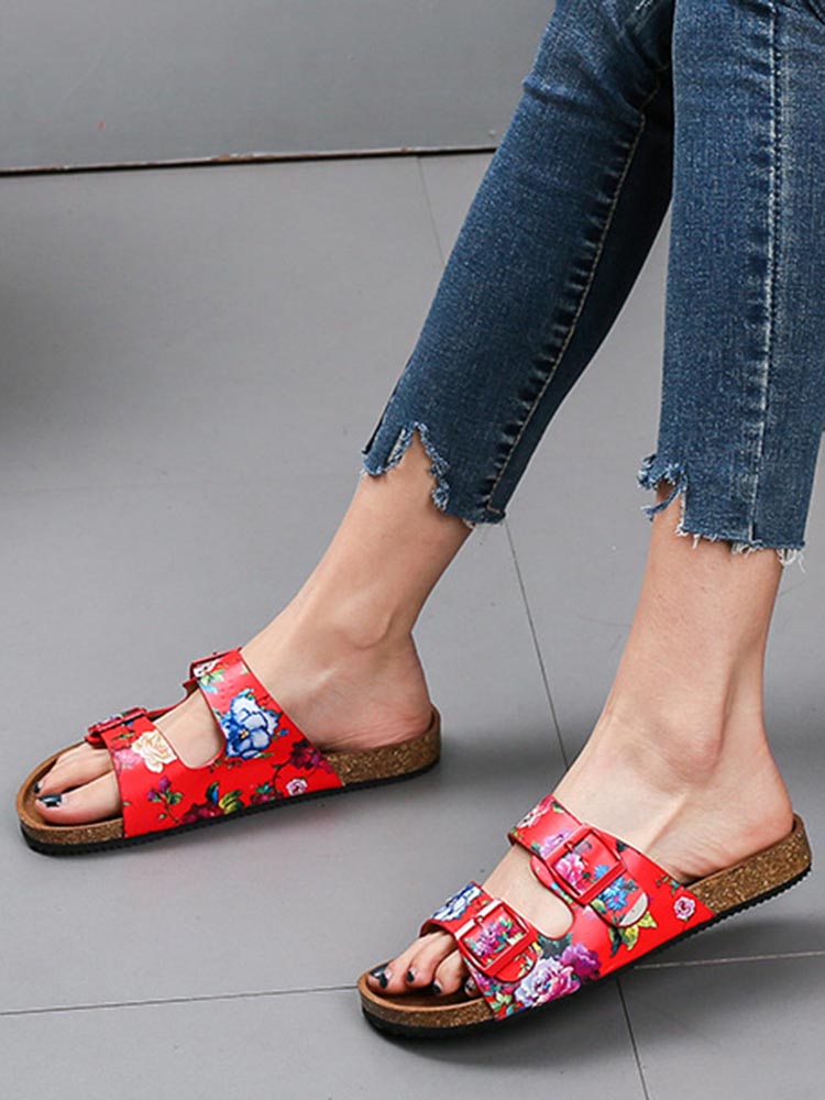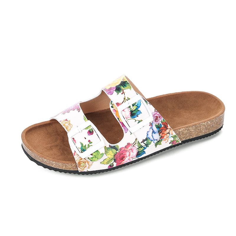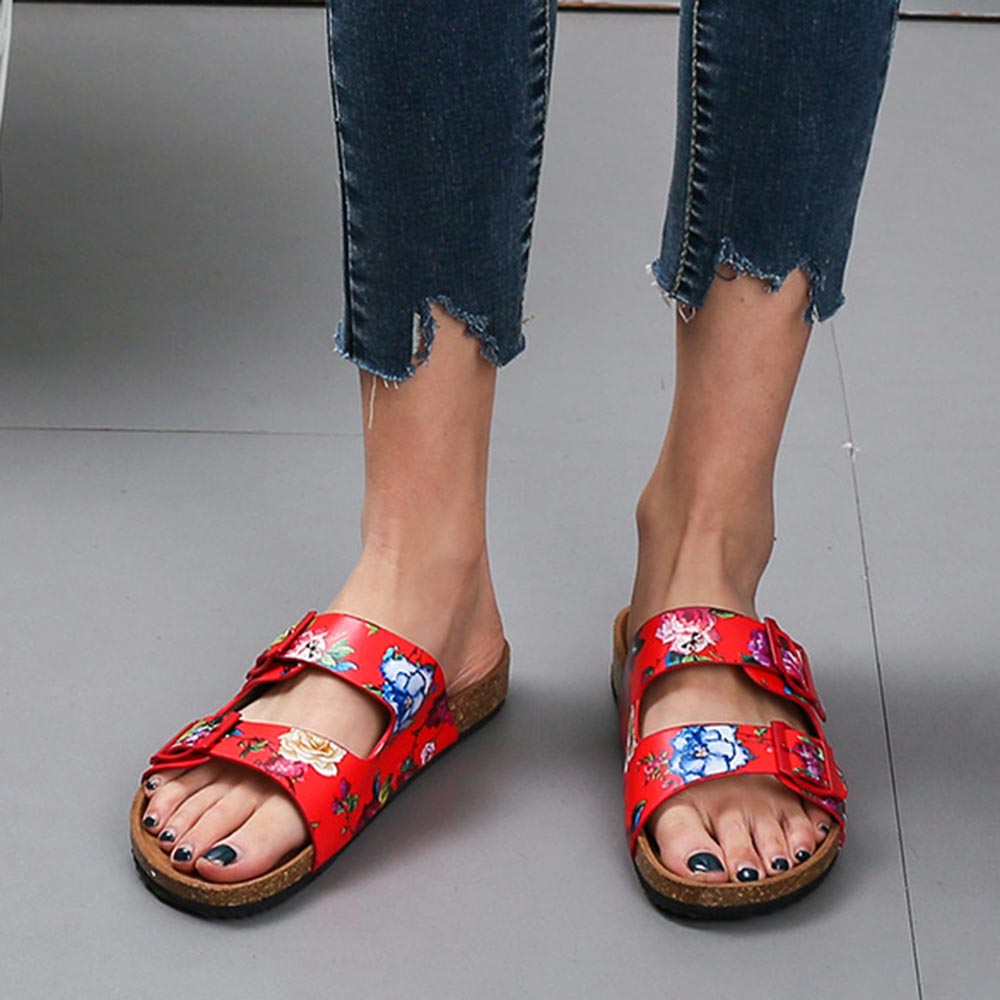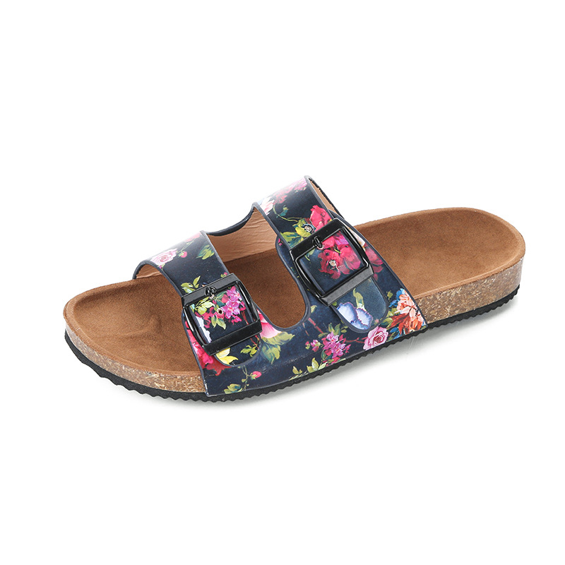 Women Double Buckle Flowers Pattern Strap Cork Footbed Slide Sandals