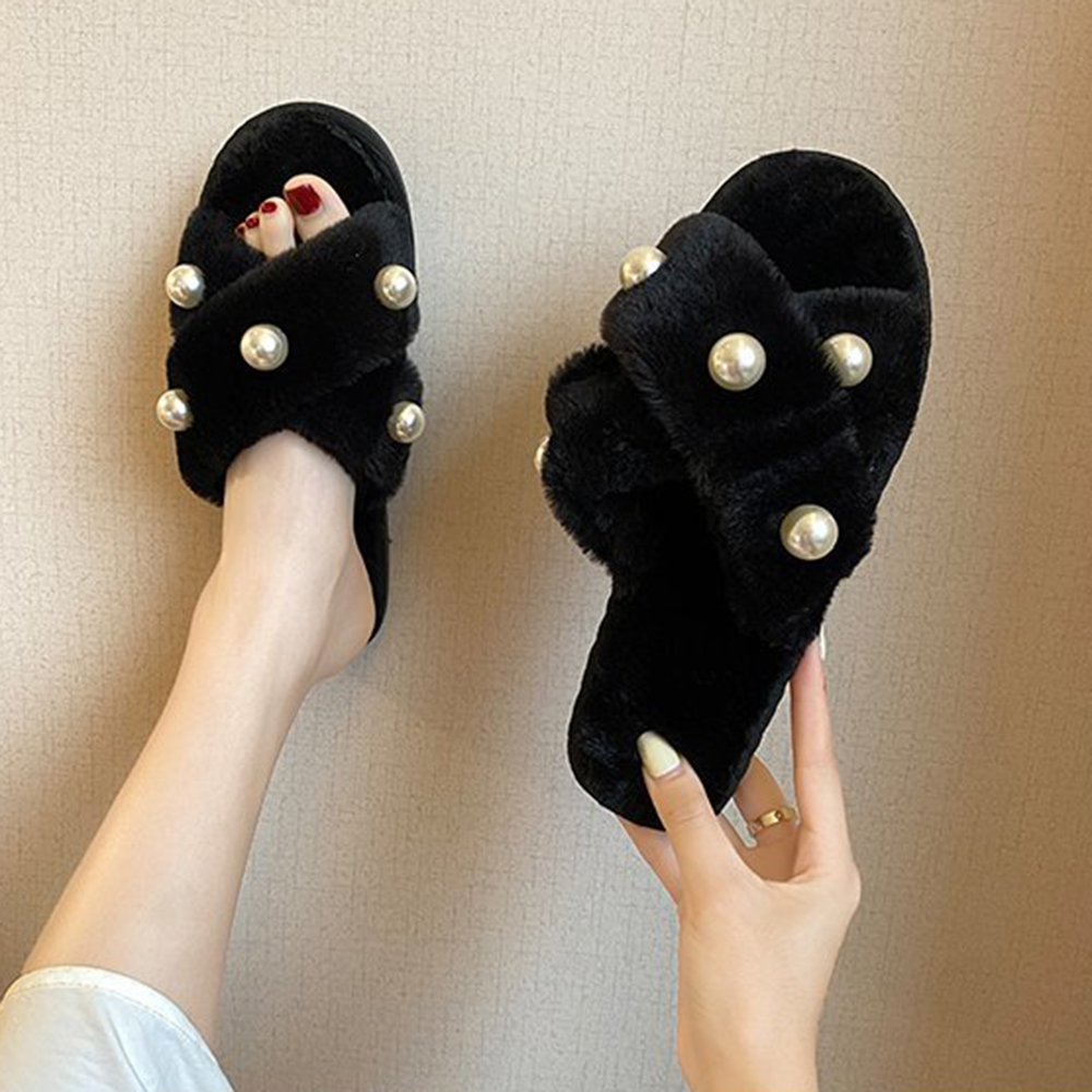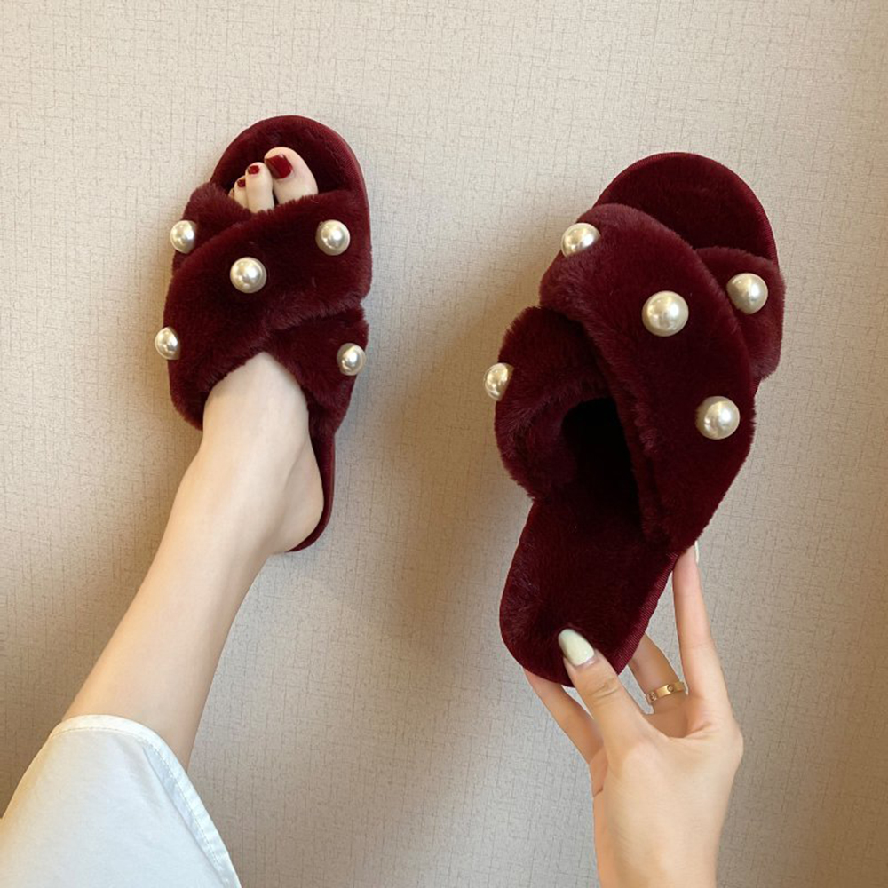 Women's Pearl Inlay Warm Lined Casual Winter Plush Slippers