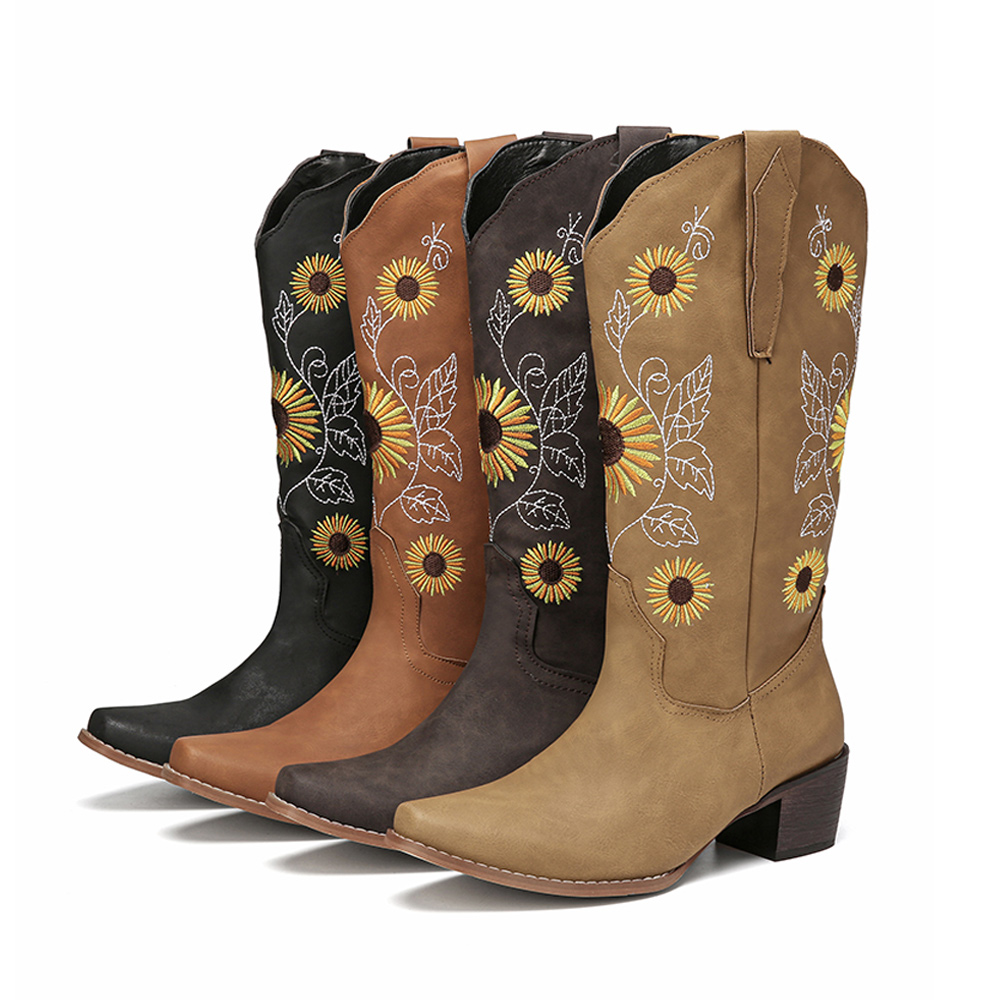 Plus Size Women Retro Sunflower Embroidered Chunky Heel Mid Calf Cowboy Boots