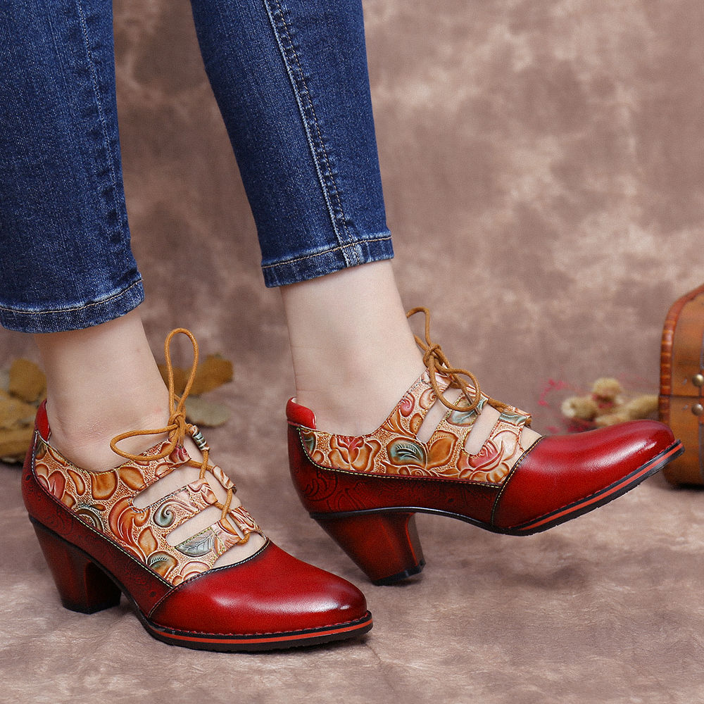 SOCOFY Leather Embossed Flowers Splicing Cut out Lace-up Chunky Heel Pumps Dress Shoes