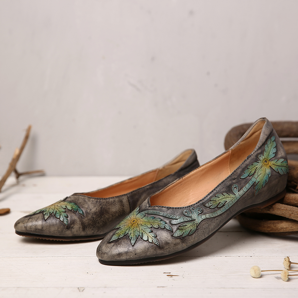 Retro Splicing Vine Comfy Genuine Leather Pointed Toe Slip On Flat Shoes