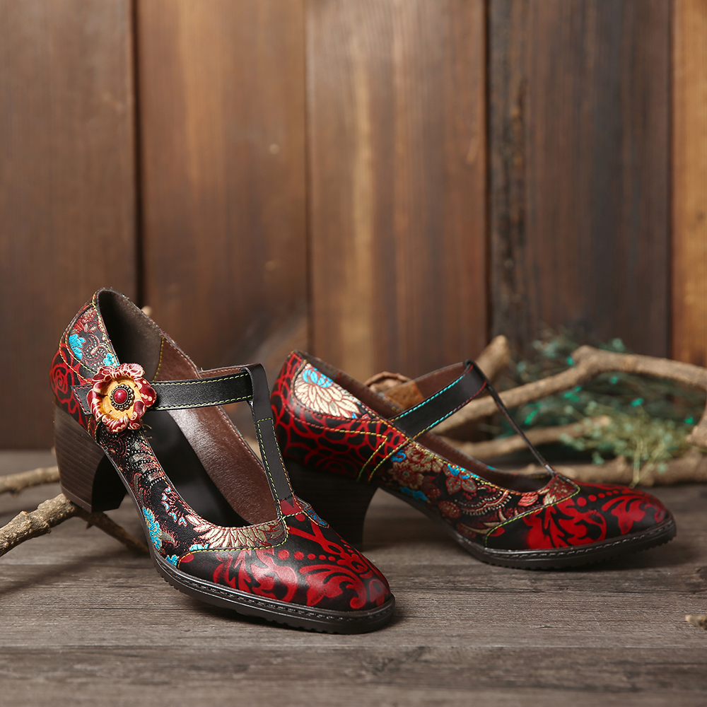SOCOFY Retro Florals Embroidery Flowers Leather Low Heel T-strap Hook Loop Pumps