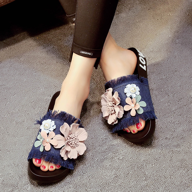 Women Casual Beach Flowers Denim Cloth Slippers