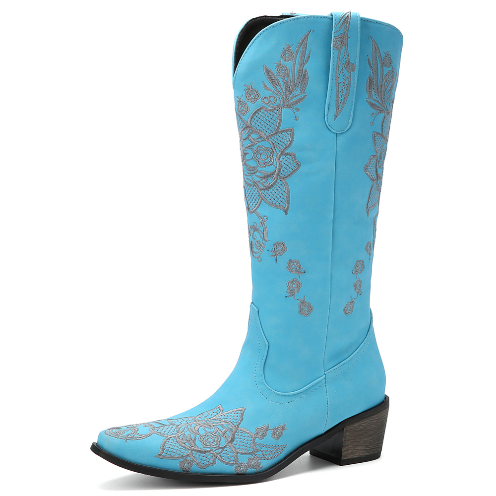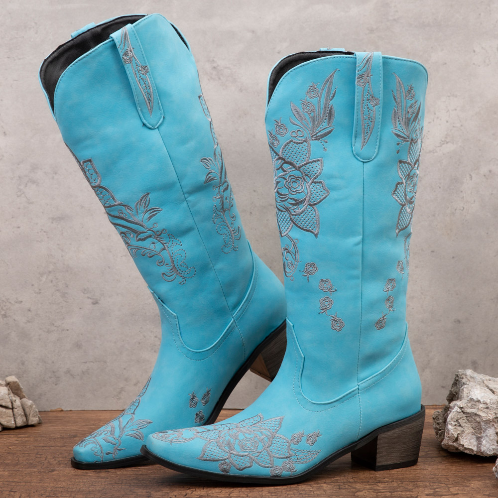 Women Floral Retro Pointy-toe Embroidery Leather V-Cut Chunky Heel Mid-calf Pull On Knight Boots