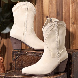 Women Retro Brief Embroidery Leather V-Cut Mid-calf Pull On Casual Martin Knight Boots
